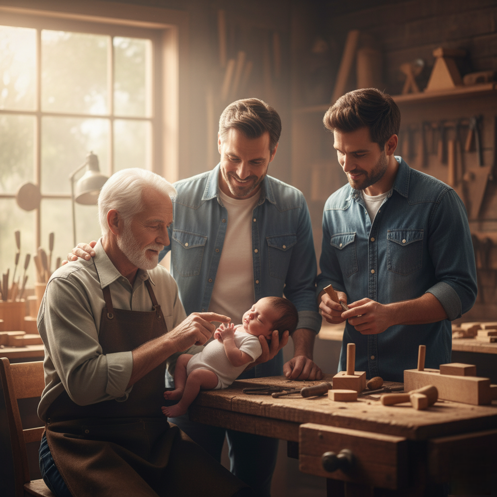 - The Newborn Baby is held by the Grandfather, who gently points to one of the tools or items, while the Father and Adult Son look on, connecting the legacy of the skill.