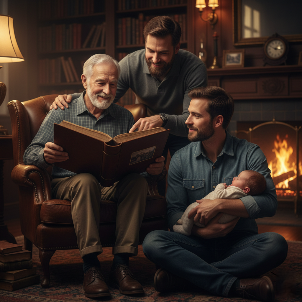 - The Adult Son and Father lean in, looking at the book with the Grandfather.