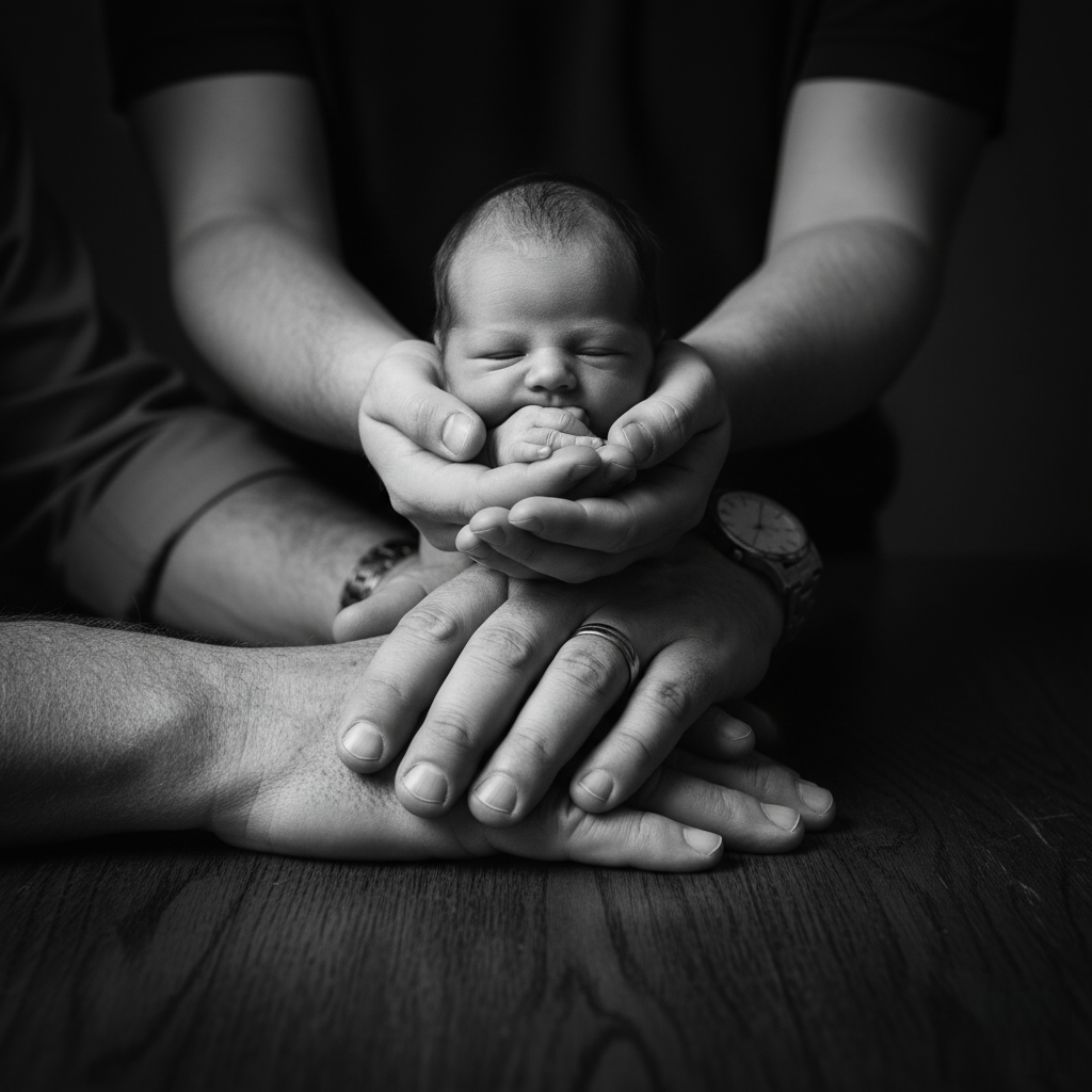 - The Adult Son’s hands cup the tiny hands of the Newborn Baby at the top.